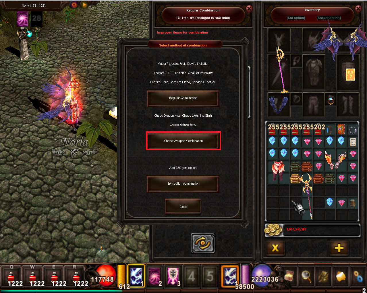 Výsledkem bude chaos zbraň (bow, staff či axe) s možnými levely či optiony. Maximál-ní úspěšnost této kombinace je 100 %. V případě neúspěšné kombinace všechny itemy jsou nenávratně zničeny.
