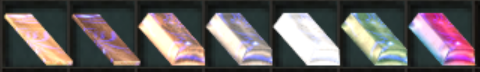 Finální podoba materiálů potřebných pro crafting (zleva Wooden Plank, Mahogany Plank, Copper Ingot, Iron Ingot, Mithril Ingot, Orichalcum Ingot a Magisteel Ingot)