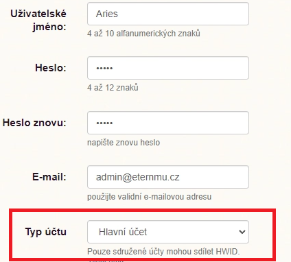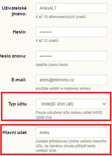 V registračním formuláři je nyní pole, kde nejprve vyberete typ účtu = hlavní účet a zaregistrujete si hlavní účet. Následně pokud chcete založit další účet (vedlejší účet (alt)), tak je nutné jej přiřadit k již existujícímu ověřenému hlavnímu účtu. Toho docílíte volbou typ účtu = vedlejší účet a následně vyplníte přihlašovací jméno hlavního účtu. Takto vytvořený účet bude spárován s hlavním účtem ve vztahu main / alt. Pro jednu domácnost lze založit 1 hlavní účet a 3 vedlejší.