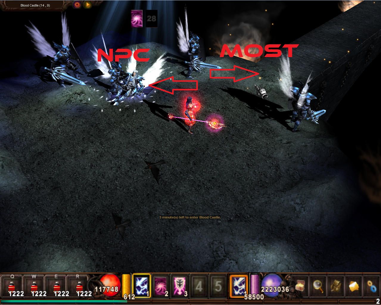 Blood Castle je klasický event spočívající na Vás. Máte za úkol porazit monstra na mostě, rozbít bránu hradu a sebrat Archandělovu zbraň. Tu odnést zpět Archandělovi, který Vás pak odmění.