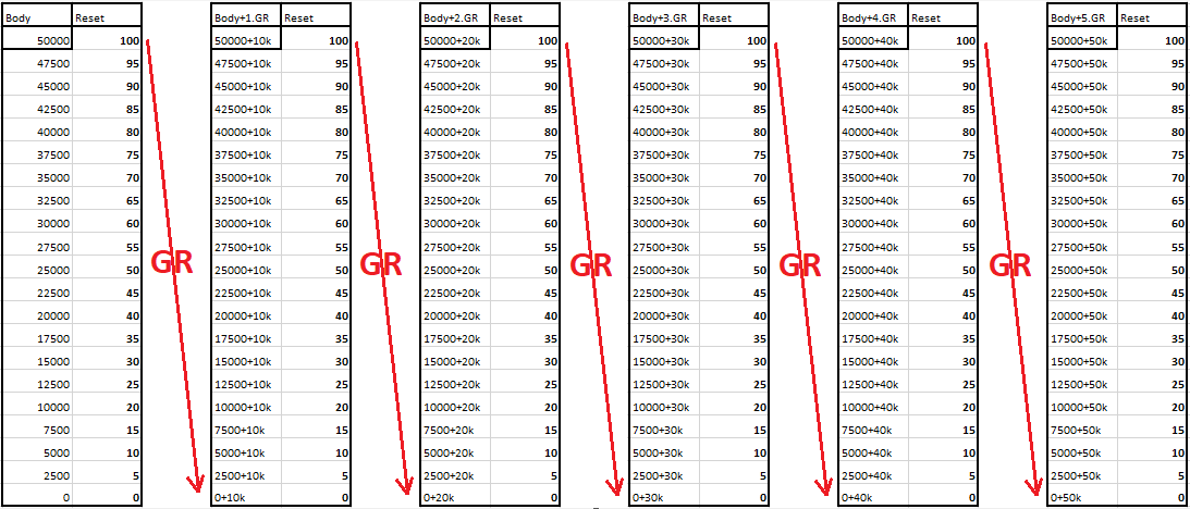 Resování je úplně nové a aby bylo správně pochopeno, tak jsme vytvořili jednoduchou nápovědu, jak to bude s přidělováním bodů po resech a grand resech. Resety jsou napsány po 5ti kvůli velikosti tabulky. Resujete samozřejmě po jednom.