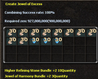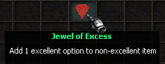 Jewel přidává 1 excelentní option do itemu se 100% úspěšností. Jewel of Excess je jedinou cestou k excelaci neexcelentního itemu a nelze s ním přidat více optionů než 1. Po použití item automaticky spadne na +0. Doporučujeme nejdřív excelovat a až poté zvyšovat item level.